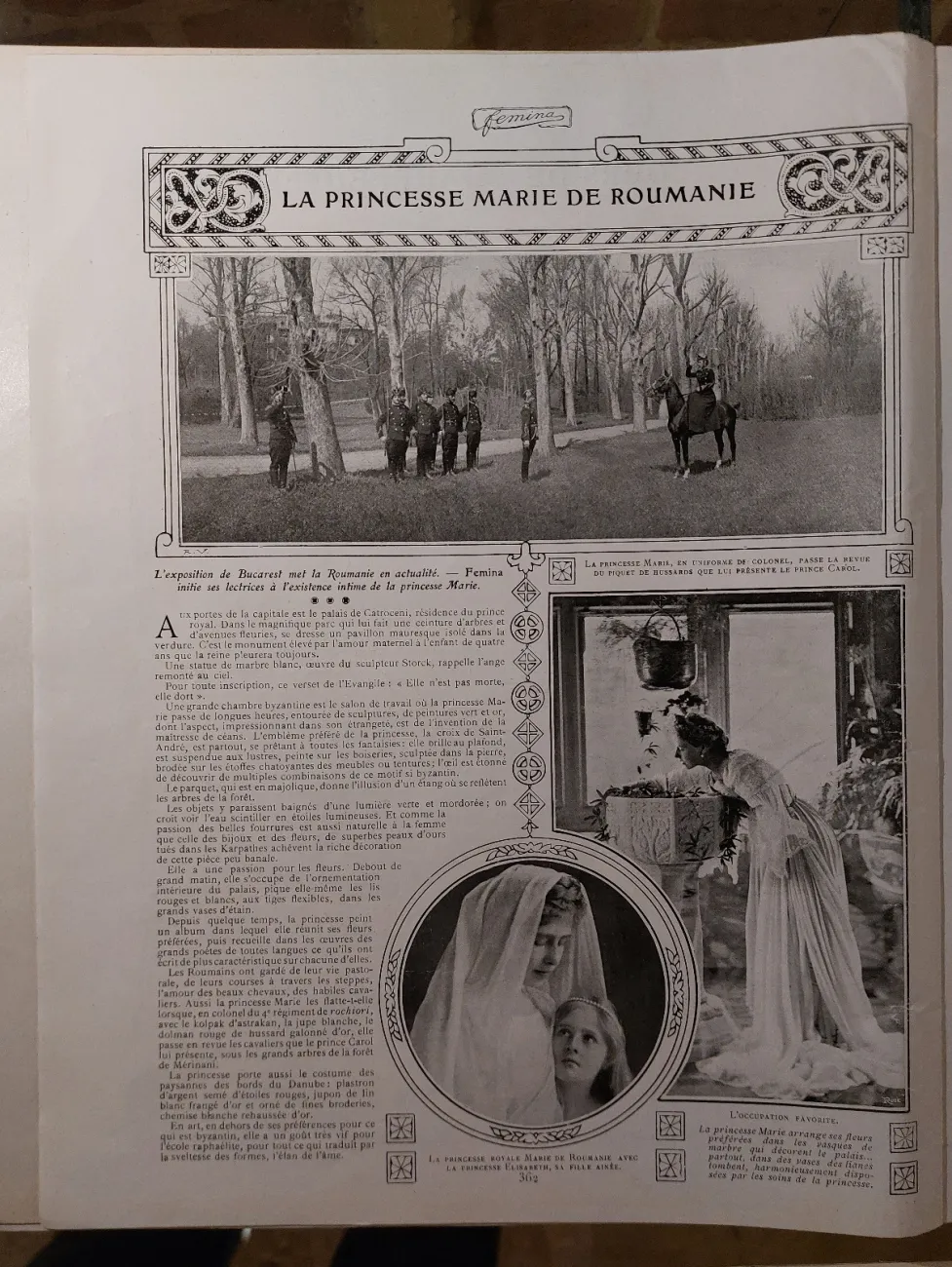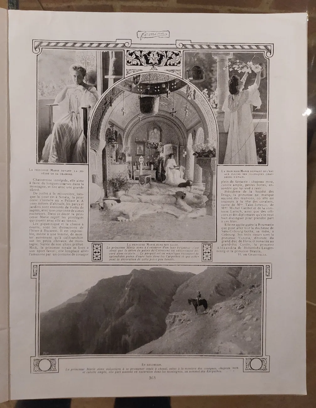 În paginile revistei, viitoarea regină apare în diferite ipostaze: alături de fiica sa, principesa Elisabeta, visătoare la fereastra palatului Cotroceni sau în grădina reședinței, culegând flori. Aflăm că îndrăgea să-și decoreze singură salonul, cu elemente orientale și motive religioase. Era o amatoare pasionată de drumeții și călărie, preferând adesea să se retragă în munții Carpați pe un cal mic specific pentru călătoriile pe munte și împreună cu loialul ei câine, Mick.